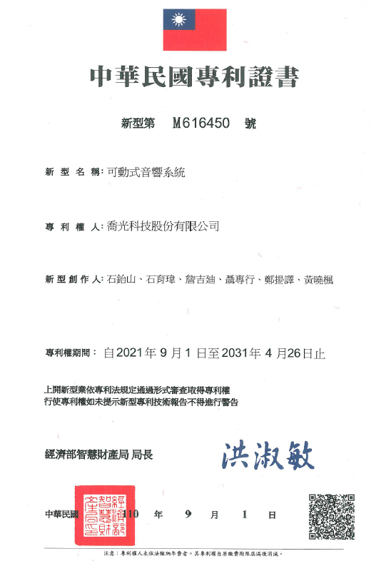 喬光科技獲得<新型專利>可動式音響系統