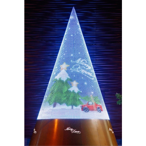 直徑5公尺高8公尺的戶外等間距電視牆,可當作聖誕樹或萬花筒使用,也可在圓錐頂部加裝企業標識。